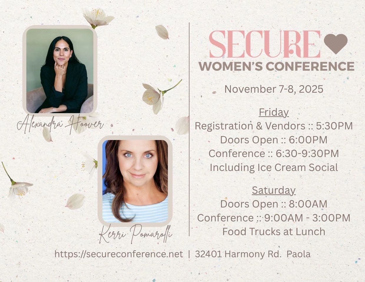 Join us November 7th & 8th to experience an engaging women's conference for ladies, ages 16 and up. Join us for a fun night with comedian Kerri Pomarolli and dive into the word with guest speaker Alexandra V. Hoover. Enjoy a time of worship, fellowship, and leave feeling secure in the woman God has called you to be.